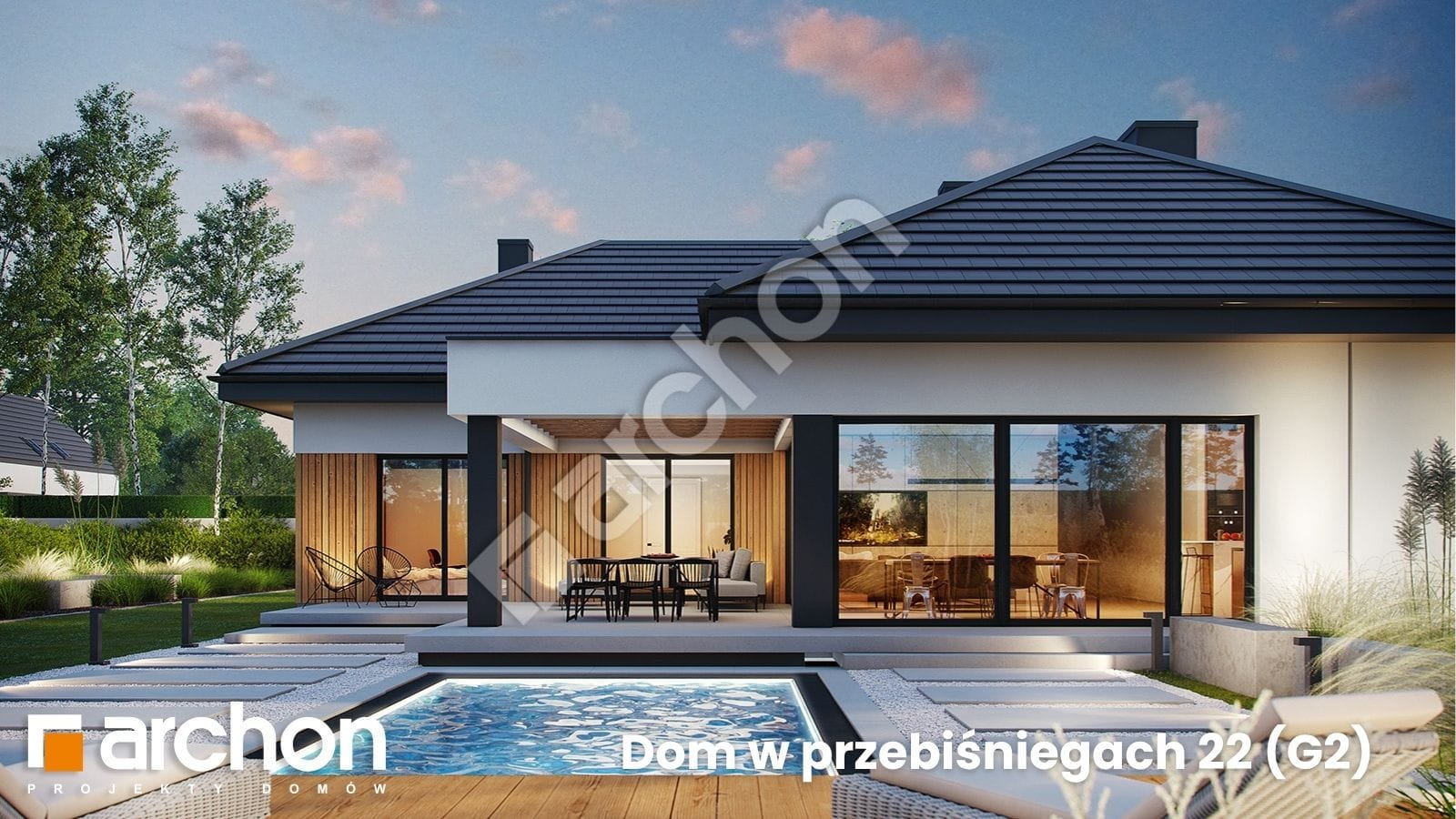 Nowoczesna, elegancka bryła „Domu w przebiśniegach 22 (G2)” z kolekcji: projekty domów parterowych ARCHON+ to efektowna forma architektoniczna z czterospadowym dachem. Duże przeszklenia od strony ogrodu otwierają wnętrze na widok przydomowego ogrodu i dodają bryle wizualnej lekkości. Wyjątkowym miejscem jest taras z efektowną pergolą – idealny na letni relaks.