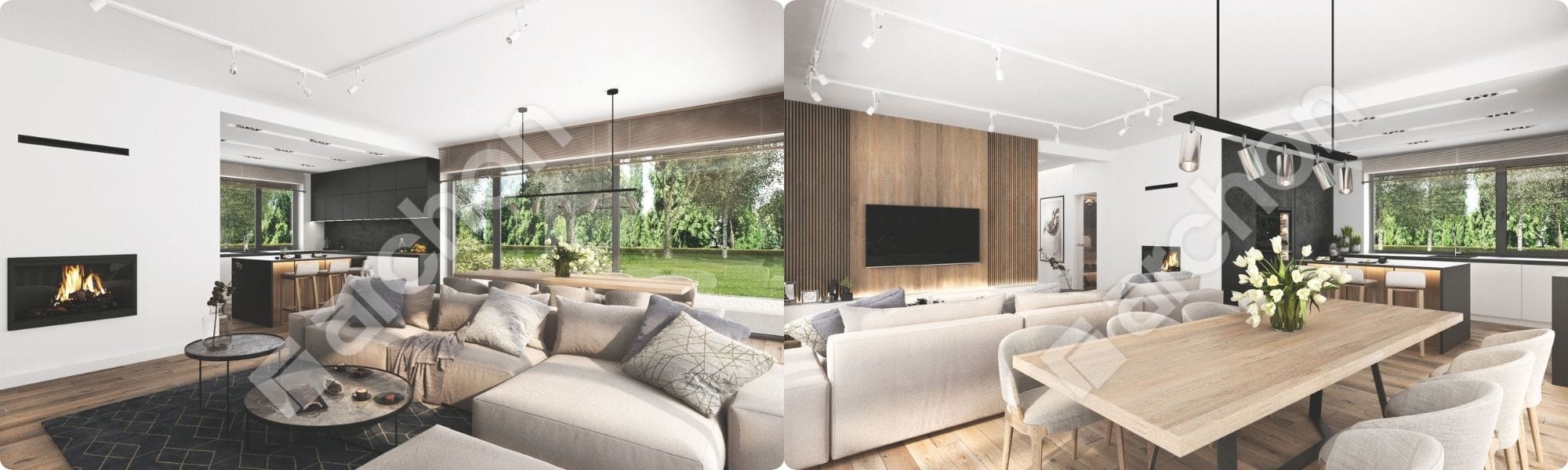Duża, doskonale doświetlona kuchnia to funkcjonalna strefa z wysoką zabudową, wyspą i spiżarnią – idealna dla tych, którzy cenią wygodę pracy i porządek. Wyspa pełni funkcję dodatkowego blatu roboczego, a także barku śniadaniowego. Zaprezentowana na wizualizacjach aranżacja podkreśla nowoczesny charakter wnętrza oraz stylistyczną spójność całej, otwartej przestrzeni dziennej.